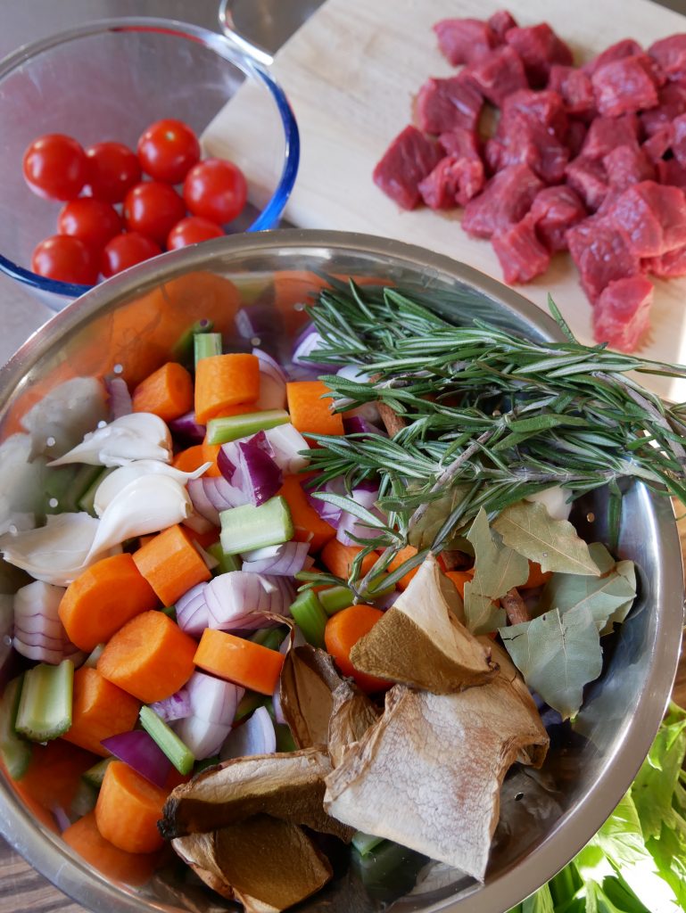 Ca. 1,5 kg Bein- oder Schmorfleisch vom Rind (dann haben Sie etwas mehr Fleisch in der Soße, es geht aber auch mit weniger Fleisch), vom Metzger in Würfel geschnitten, 3 rote Zwiebeln, grob gewürfelt 6 ungeschälte Knoblauchzehen (wenn es geht frisch), 4 Stangen Staudensellerie, grob gewürfelt, einige Rosmarinzweige und Lorbeerblätter, 1 gute Handvoll getrocknete Steinpilze, 3 Zimtstangen, 2 große Dosen Tomaten (Abtropfgewicht 450g), ½ L Rotwein (oder einen Schwups mehr), Olivenöl, Salz und Pfeffer, Puderzucker, Tomatenmark ein paar Stängel Petersilie, Alufolie