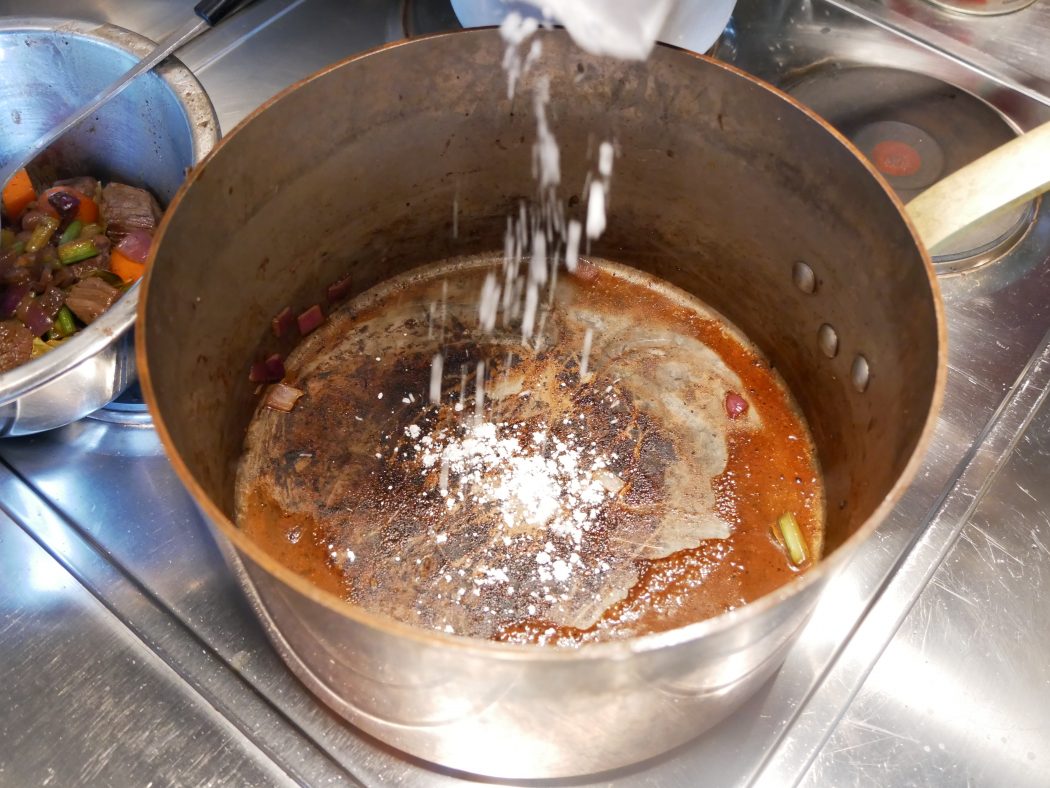 Wieder etwas Öl in den Topf (sparsam, damit sich Röststoffe bilden können) und das Fleisch portionsweise darin anbraten. Beim Braten wieder etwas mit Salz und Pfeffer würzen. Auch das Fleisch kurz beiseite stellen. Jetzt etwas Puderzucker in den Topf geben, einmal leicht streuen, bis Sie 1-2 TL zusammen haben. Das Tomatenmark (ca. 1Eßl. oder etwas mehr) dazu und kurz anschwitzen, mit dem Rotwein ablöschen. Das Fleisch und Gemüse wieder in den Topf geben, die Tomaten dazu und durchmischen – alles zum Kochen bringen. Jetzt den Topf mit Alufolie hübsch verschließen, einen Deckel noch auflegen und den Topf für etwa 4 Stunden ab in den Ofen.
