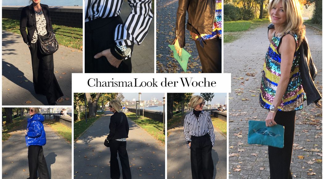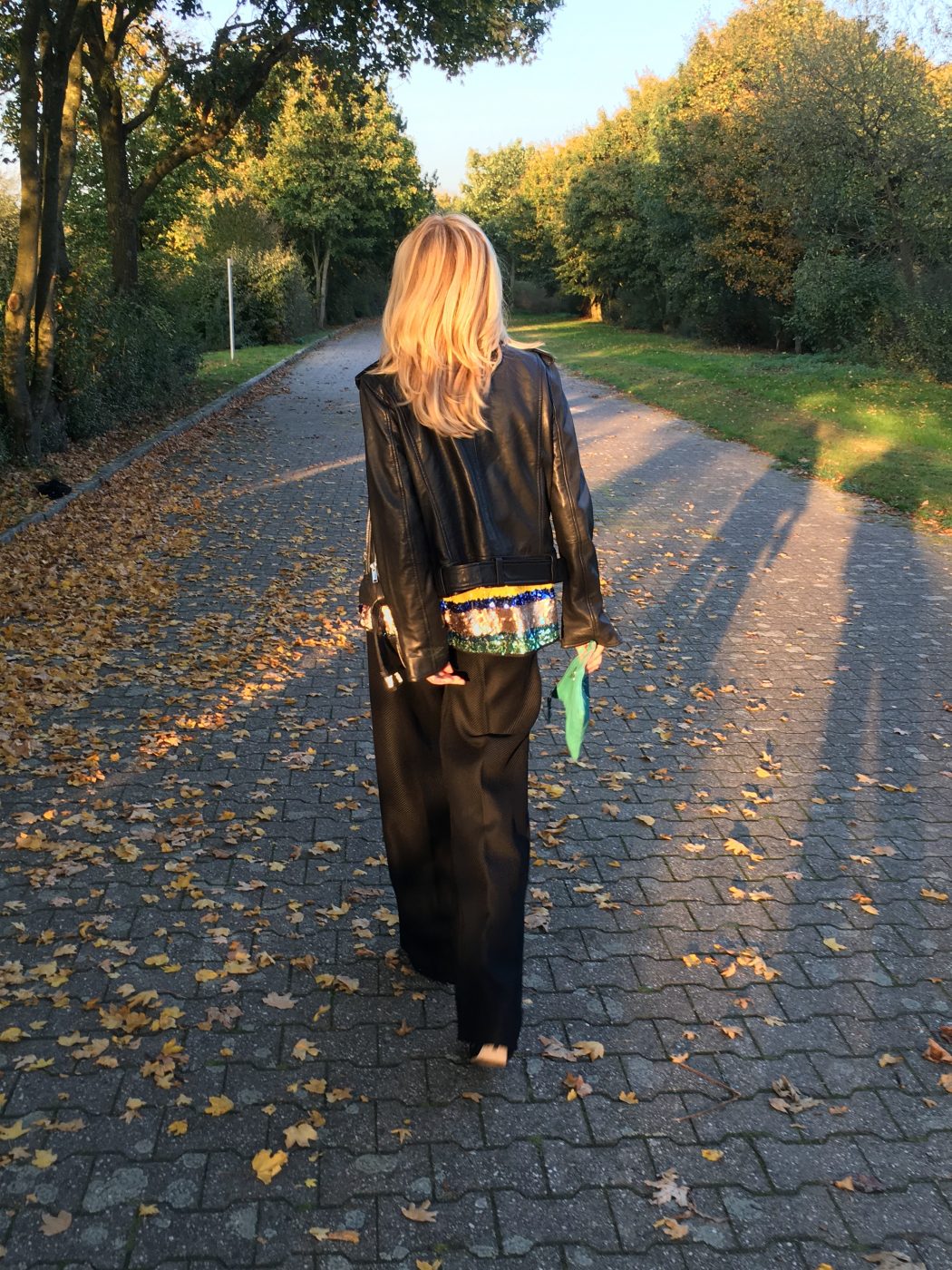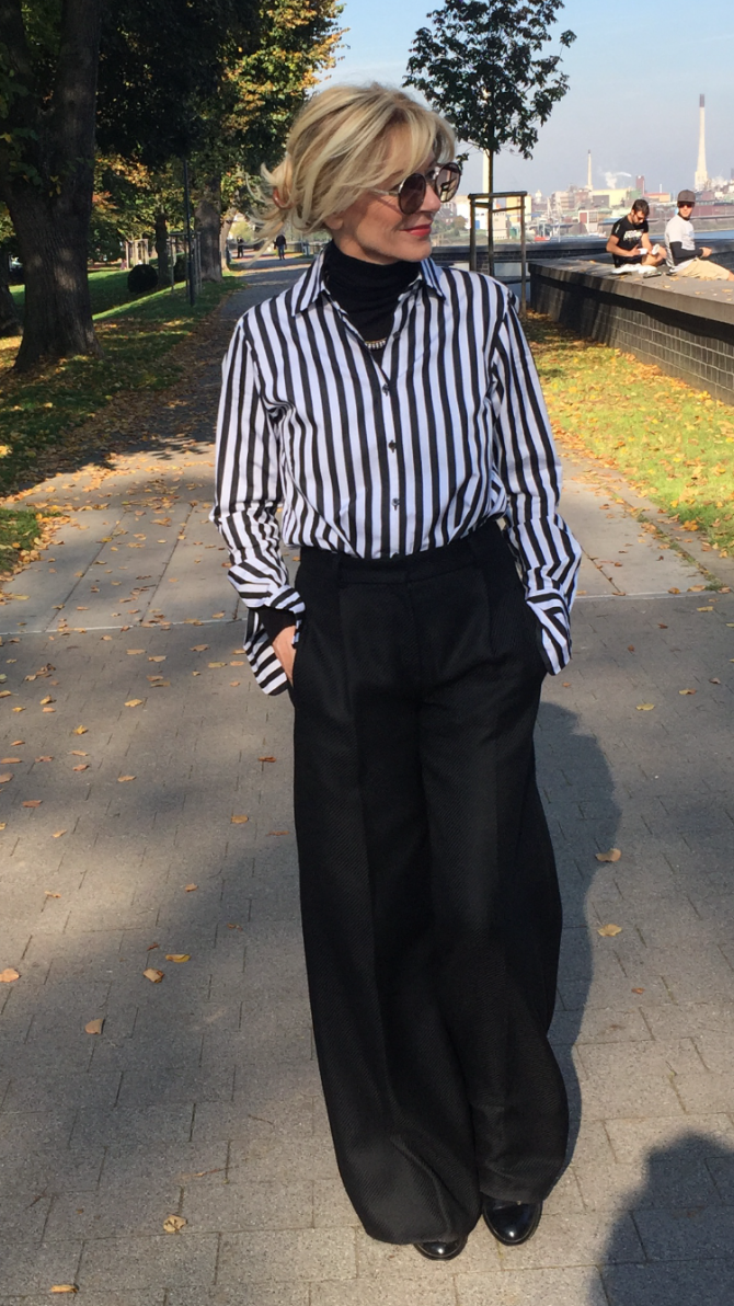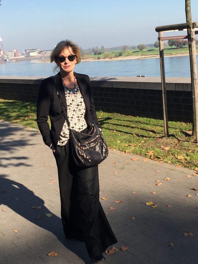 Dazu ein helles, lockeres Top (Vintage), das den Oberkörper streckt, wenn es länger als der Blazer fällt. Außerdem gut, wenn man – wie ich – einen größeren Busen hat. Ein lässiges Business-Outfit, das mit kleinerer Handtasche auch schon abendtauglich ist. Männer mögen keine weiten Hosen. „Die schon!“, sagte meiner. Der Po kommt mit der Schnittführung nämlich trotz weiter Beine schön rund raus! Bei großen Frauen finde ich weite, überlange Hosen toll mit Sneakern. Bei meiner Größe schnalle ich mir aber lieber ein paar Absätze unter, obwohl dass fußtechnisch gesehen auf Dauer schmerzt.