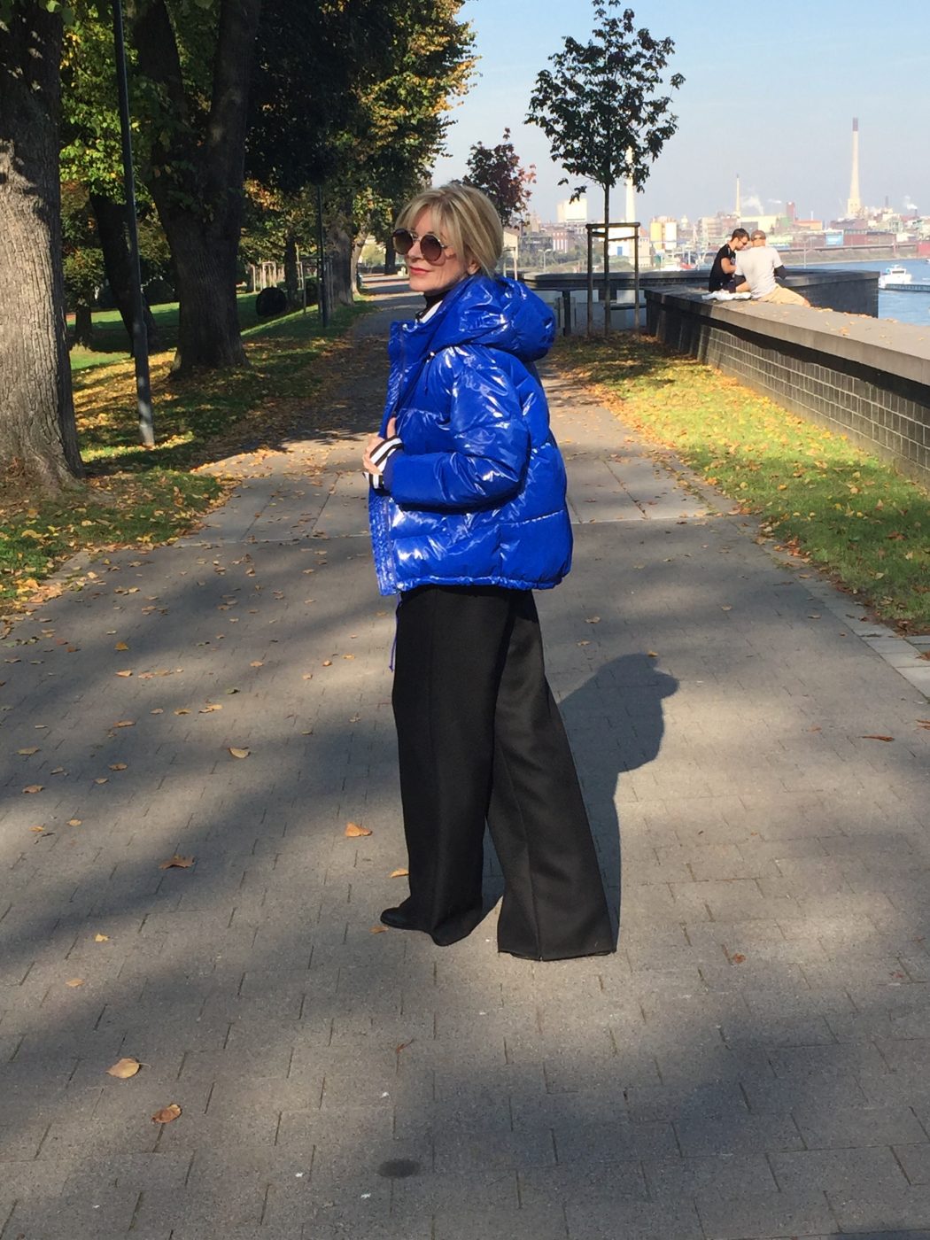 Die Variante mit Streifenbluse kommt mit Rolli drunter und in den Bund getragen warm & modern rüber. „Reingesteckte“ Mode steht mir, mit kürzerem Oberkörper und mehr Busen, meist nicht – funktioniert hier aber gut mit längerer Beinoptik (Stiefel mit High-Heel). Knallige Jacke drüber mag ich besonders zu der graphischen Streifenbluse. Durch die Michelin-Optik wirke ich zwar wieder kleiner – aber, was soll’s! An der Farbe kam ich nicht vorbei, sie sieht super fröhlich aus und passt auch toll zu Jeans.