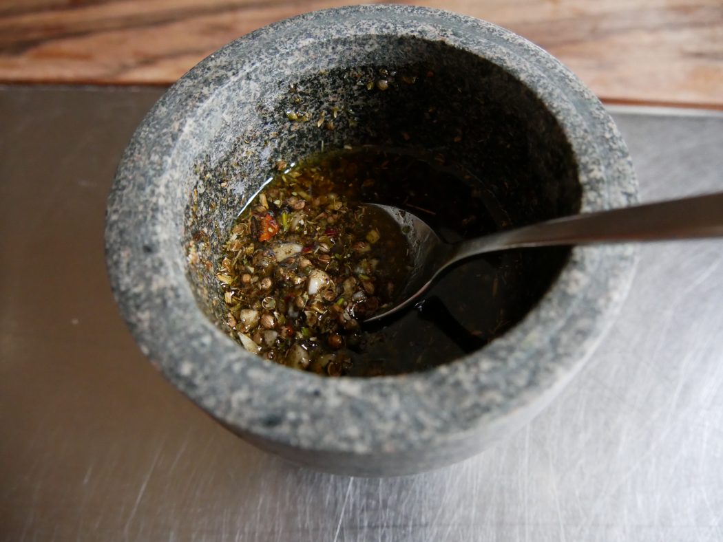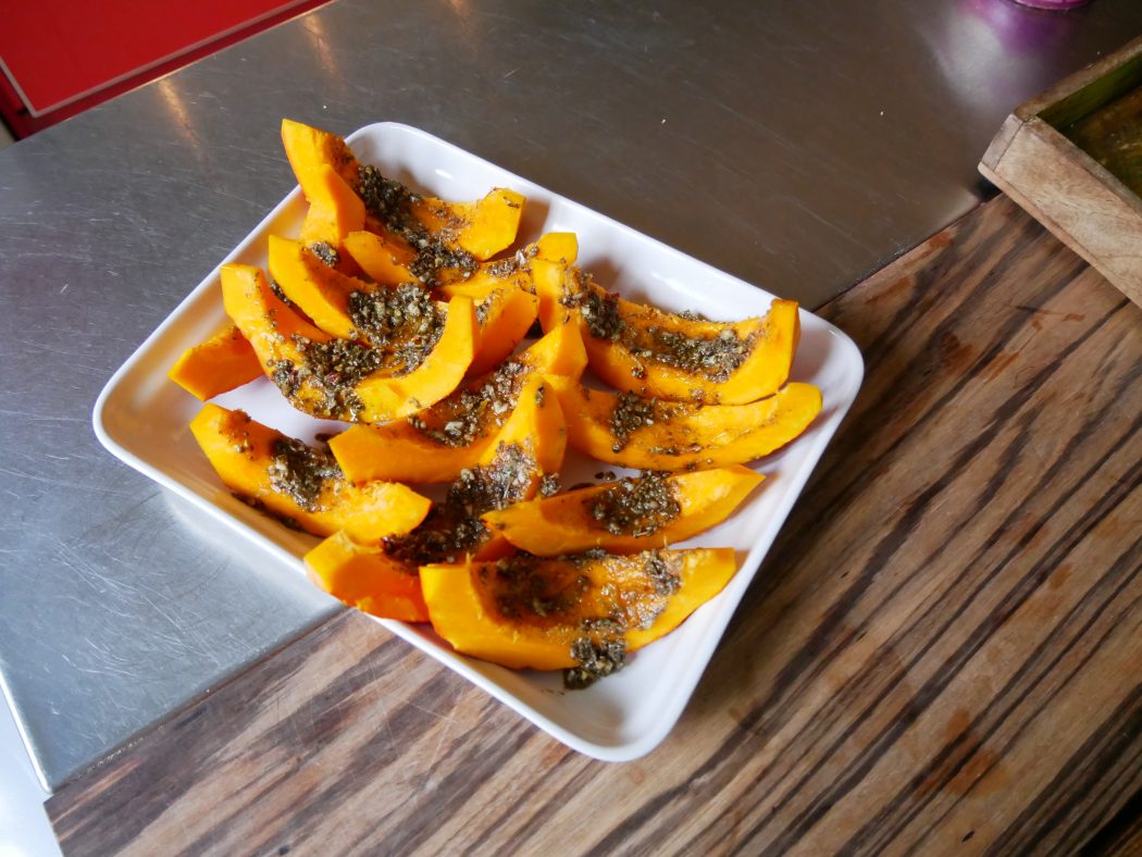 Den Backofen auf 200 Grad (Umluft 180 Grad) vorheizen. Kürbis waschen, mit einem Messer in Spalten teilen und mit einem Löffel die Kerne entfernen (kann man z. B. mit Olivenöl und Meersalz in der Pfanne zu „Nüssen“ rösten). Alle getrockneten Kräuter und Gewürze in einem Mörser zerstoßen und dann mit dem Öl zu einer fließenden Soße verarbeiten. Keine Angst, schütten Sie vorsichtig immer ein wenig Öl dazu, es wird nicht zuviel.