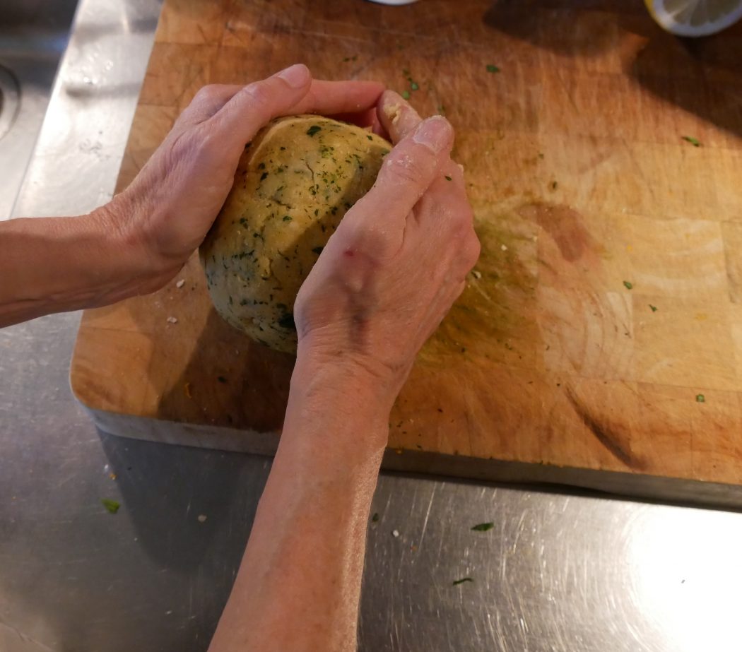 Dann mit dem Garn zur anderen Seite wandern – dabei die Rolle an ein bis zwei Stellen noch einmal umbinden – und am anderen Ende, wieder mit einer Schlaufe das Ganze festzurren. Jetzt lässt sich die Rolle auch gut ein paar Stunden bis zum Einsatz an einem kühlen Ort aufbewahren.