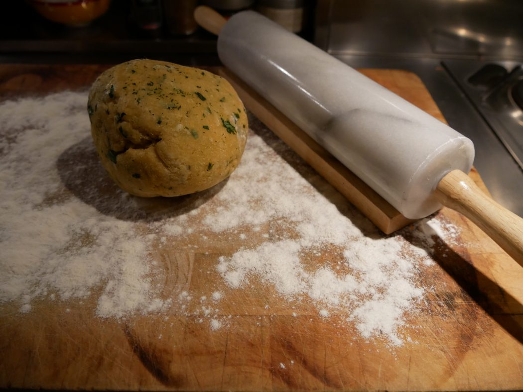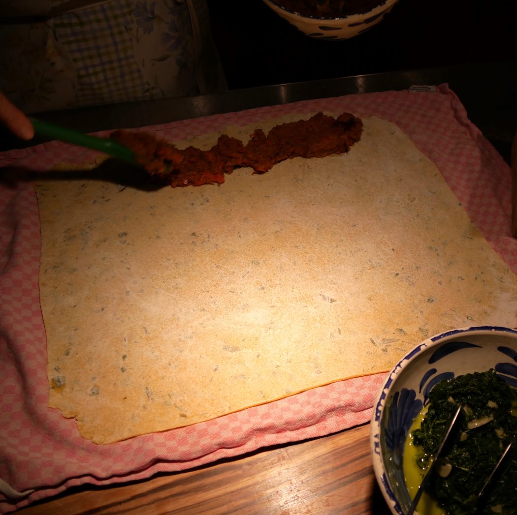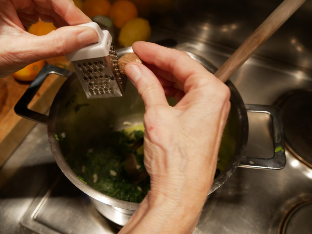 Spinat und Kürbis lässt sich gut schon einen Tag vorher vorbereiten und dann im Kühlschrank bis zum Einsatz aufbewahren: In einem großen, hohen Topf etwas Olivenöl erhitzen, Majoran und Oregano und den Knoblauch hineingeben und sanft anschwitzen. Den Spinat hinzufügen und zusammenfallen lassen. Anschließend mindesten 1EL Butter oder mehr und frisch geriebene Muskatnuss zugeben. Die Flüssigkeit unter Rühren verkochen lassen, mit Salz und frisch gemahlenem schwarzen Pfeffer würzen. Achten Sie bei der Weiterverarbeitung später darauf, dass der Spinat nicht zu feucht ist – die Restflüssigkeit eher wegschütten, sonst riskieren Sie, dass der Nudelteig – vor allem, wenn er länger auf sein Wasserbad wartet – durchsuppt. Weiterverarbeiten oder bis zum Einsatz im Kühlschrank aufbewahren.