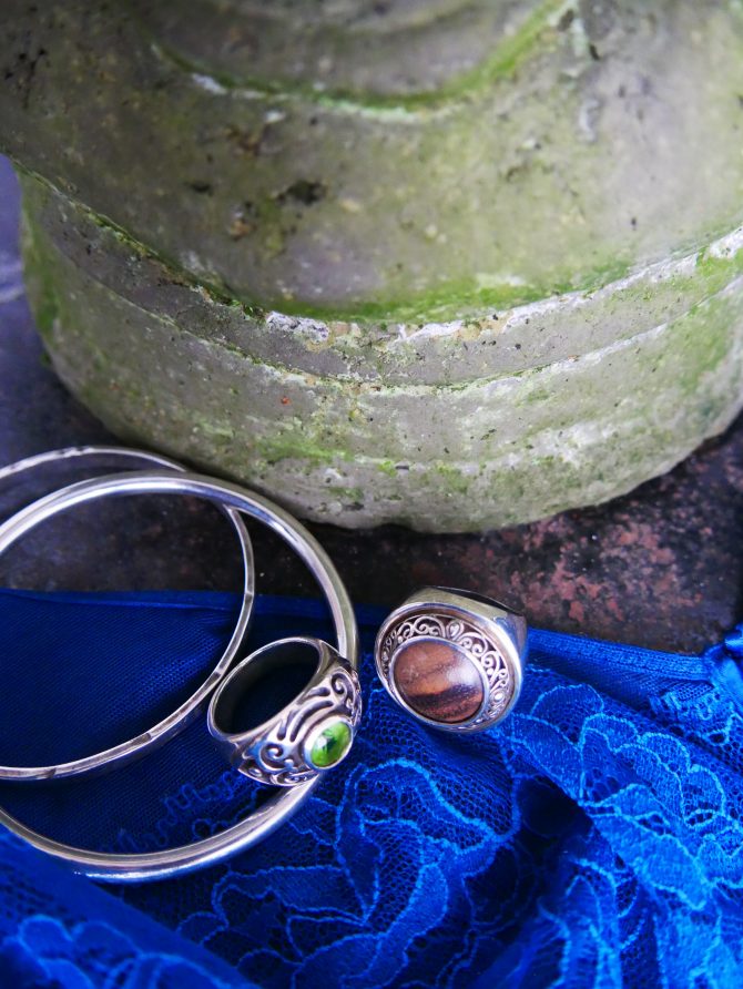 Rosenholz und grüner Zirkonia in handgearbeiteten Silberringen. Die Armbänder sind gehämmert oder mit Sternzeichen.