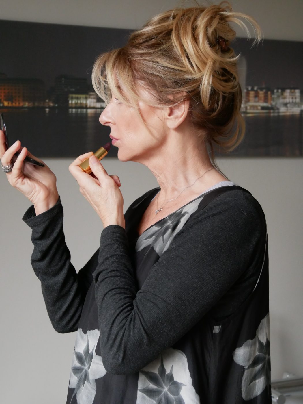 Gegen platten Ansatz habe ich was und föhne mit einem Styling-Spray für Volumen und Halt dagegen. Nach dem Waschen sprühe ich es in die Ansätze und noch 2-3 „Pffft“ in die Längen. Danach die Haare mit warmer Föhnluft vom Ansatz immer nach oben und über die Rundbürste ziehen – die Spitzen bekommen noch einen kleinen Extra-Schwung nach innen. Durch das „gegen die Schwerkraft föhnen“, entsteht eine Art Lift-Effekt, der die Haare immer wieder in die neue, geföhnte Struktur zurückspringen lässt – auch nach Mütze ab! Man braucht ein bisschen Übung, aber bei meiner Länge bin ich nach ca. 20 Minuten stylen fertig. Haarspray drüber, hält! Stylinghelfer: Tecni Art, Pli Spray Thermo Modelant, von L’Oréal. „Root Lift“ Ansatzspray von Sachajuan, „Kerasilk Style Mixing Effect“ von Goldwell.