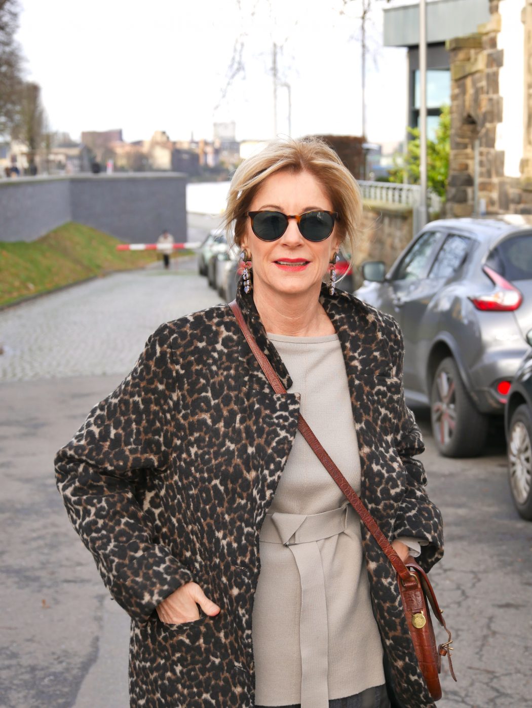 „Nicht mein Stil“, gilt hier nicht! Camel mit Leo ist einfach der Haut- und Figurschmeichler schlechthin. Zudem haben Pulli, Hose und Mantel die perfekte Balance aus gemütlich-elegant mit überraschendem Twist. Den Mantel habe ich hier schon vorgestellt und mittlerweile ist er zu meinem Lieblings-Wetterschutz geworden. Durch die Farbkonstellation Beige/Grau/Braun/Schwarz passt er zu allem und jedem und – Animal-Prints sind längst Klassiker und immer eine Investition wert. Mode-Tipp: Leos sind Einzelgänger und vertragen sich auch im Outfit nicht so toll mit Partnern ihrer Art. Gut können sie dagegen mit Mustern, z. B. mit Blumen-Print und starken Farben.