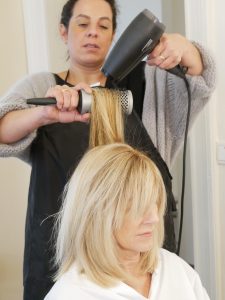 Der Schnitt ist dann ein echtes Statement – klare Kante hinten, feine Stufen rund ums Gesicht. Die unterschiedlichen Längen vorne sind ein Überbleibsel meines fransigen Schnitts vorher. Aber genau das gefällt mir, weil es dem Long-Bob mehr Volumen gibt. Simone schneidet nach der natürlichen Struktur der Haare: Alles wächst nach vorne, Simone kappt die Strähnen im naturgegebenen Flow, so habe ich hinterher weniger Mühe beim Stylen. Das Föhnen ist denkbar einfach und dauert sogar kürzer als vorher: Zuerst Festiger in den Ansatz, dann über eine große Rundbürste für mehr Stand nach oben und glatt mit Schwung nach innen. Cool, modern und jünger(!) habe ich mich übrigens sofort gefühlt. Bis auch das Gefühl „richtig gut“ bei mir ankam, hat es 2x Haare waschen gedauert. Jetzt freue ich mich rundum über meinen neuen Look und das tolle schnelle Styling.