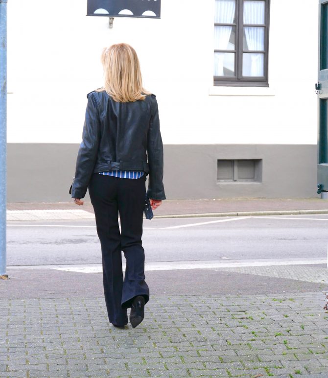 Ich habe meine Schoko-Lederhose mit frischen Blautönen kombiniert – hellblau wirkt überraschend lebendig dazu.