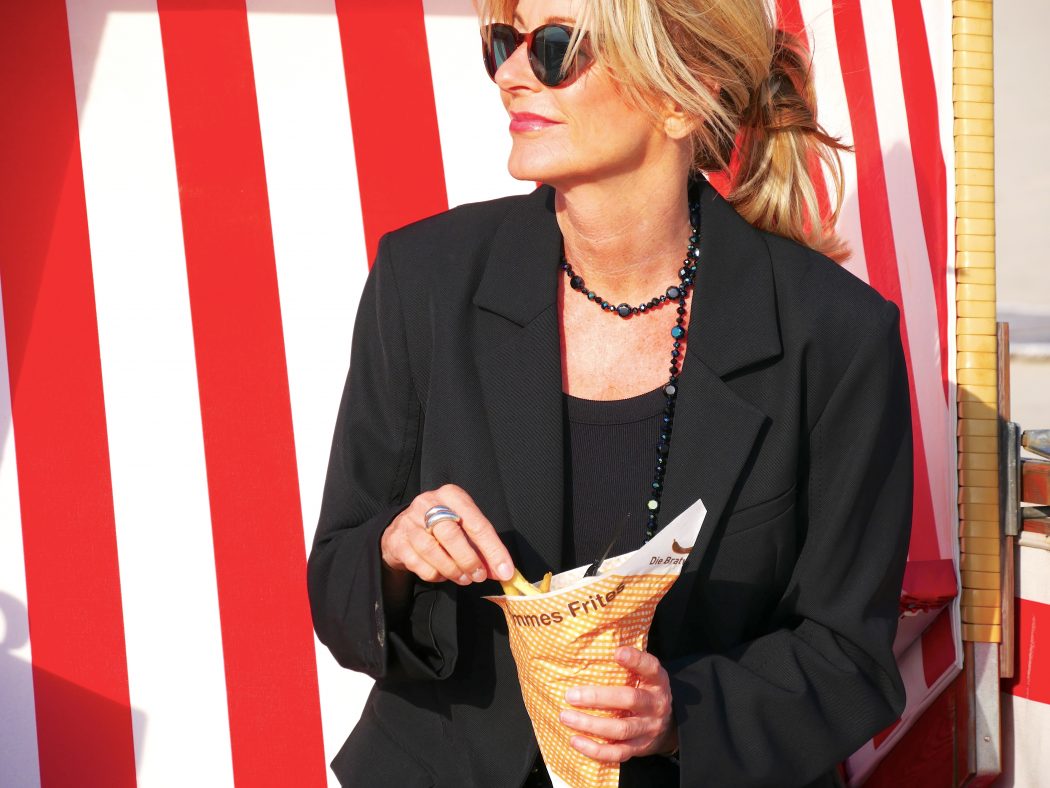 Toll aussehen muss erst recht zu zweit sein! Was ganz einfach geht: Kleid drüber und Spaß haben! Unbeschreiblich weiblich schwingen solche langen fließenden Silhouetten um einen rum. Blasse Beine sind auch noch versteckt und für schöne Schritte muss man es elegant raffen – zumindest im Sand – ich fühle mich auf der Stelle graziös, kapriziös! Kaufen Sie schmal sitzende Kleider in lockerer Optik (eine Nummer größer!), dann sitzt es besser und Pommes/Mayo passen auch noch drunter. Pölsterchen verstecke ich übrigens gern mit einer drapierten Strickjacke um die Hüften (siehe Tipp schwarzes Kleid unten!).