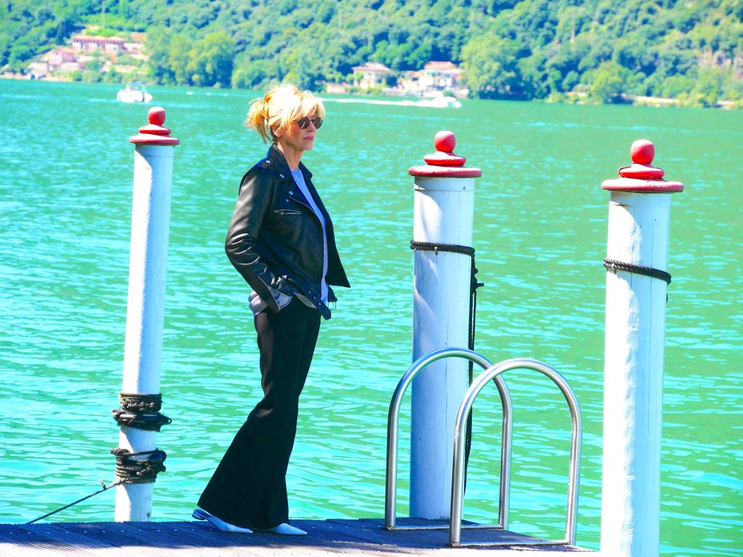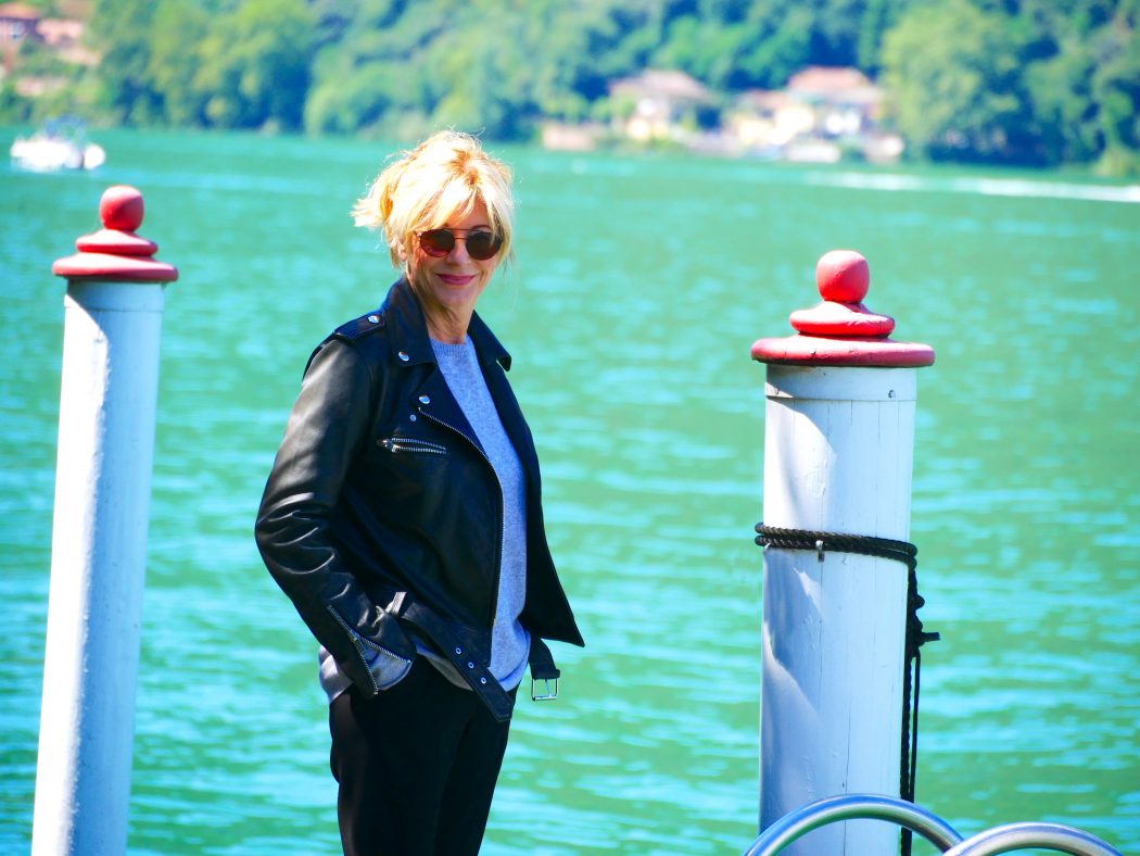 ModeInfo: Bikerjacke: Zara, ähnlich hier. Hose: Zara, ähnlich hier. Cashmere-Pulli: Grey von Schmaus, ähnlich hier. Mules: Zara. Kette: CharismaCompany.