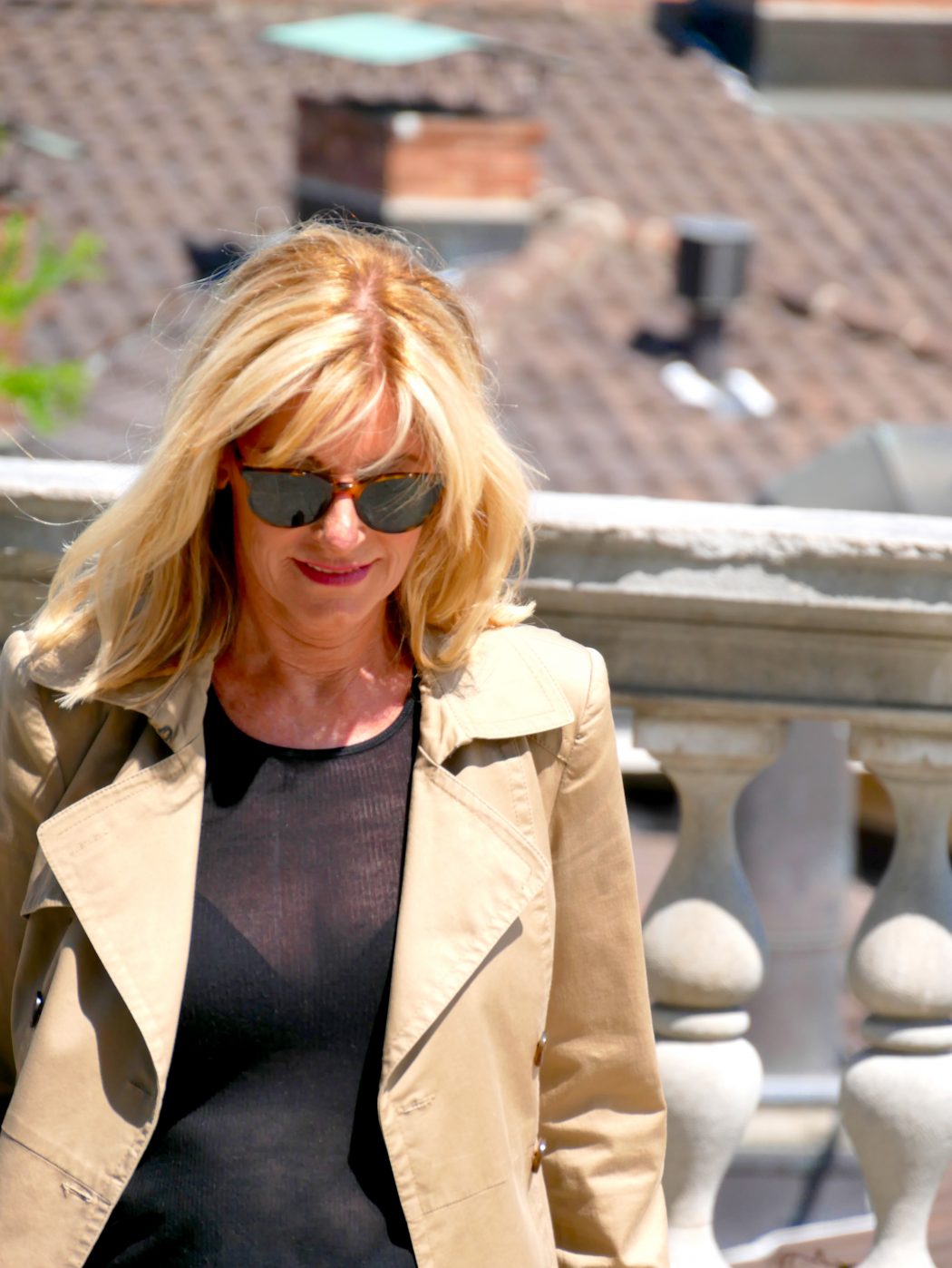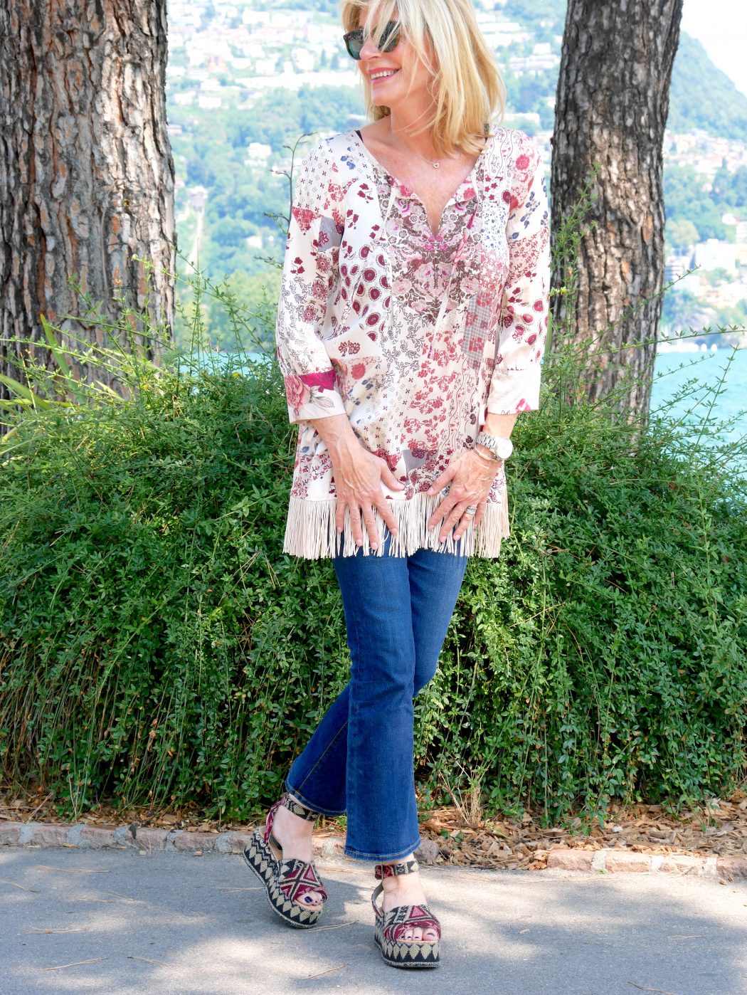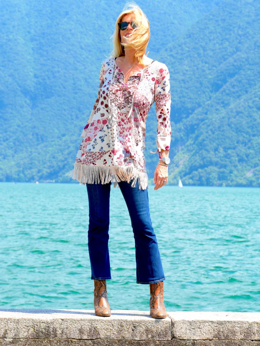 Den Bohemian-Stil gibt es schon länger und immer wieder. Man könnte ihn als „von allem ein bisschen“ beschreiben, denn fokussieren fällt schwer. Diese Saison gibt es viel Ethno-Chic, Stickereien und Ikatmuster dazu. Mir gefällt der Look mit swinging Fransen oder abstrakten Mustern supergut. Um ein bisschen Ruhe ins Outfit zu bekommen, mixe ich die dekorativen Stücke gerne mit Denim, einem klassischen Trench und mit Schwarz oder Grün – beides It-Farben im Herbst! Meine Bikerjacke in Oliv habe ich schon lange, sie dreht aber immer noch jedes Outfit sofort auf „lässig“. Damit das so klappt, ist eine perfekte Passform wichtig: Achten Sie auf einen mäßig engen Sitz an Schultern und Brust und auf schmale Ärmel, dann freut einen das gute Stück ewig. Tipp für lange Beine in Hosen: Schuhe mit Spitze, Absatz und bei Mustern eine dunkle Farbe aufgreifen. Die Fransen-Tunika harmoniert schön zur leicht ausgestellten 7/8 Jeans. Dazu kombiniere ich Plateau-Sandalen mit Ikatmuster vom letzten Sommer oder Leo-Booties mit Absatz – trage ich mittlerweile auch in der vierten Saison. Leos sind wahre Schätze, weil sie mit anderen Mustern sofort gut Freund sind und hier den legeren Stil sogar noch verstärken. Einzige Regel dabei, die Farbfamilie muss stimmen. Beautytipp! Zum Boho-Look passt natürlich schimmernde, sonnengeküsste Haut. Wer dem Tan-Effekt ein bisschen nachhelfen möchte, benutzt Bräunungscreme ( z. B. von Nivea,Tücher von Garnier oder Comodynes) und beim Make-up Bronzer – wenn die Haut noch gebräunt ist auch gerne mit Goldschimmer (mit und ohne Gold intus, z. B. von Guerlain, Artdeco, Maybelline).