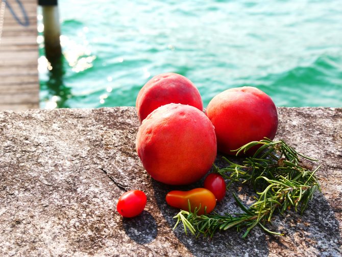 Oder Marmelade mit Pfirsichen, Tomaten, Rosmarin.