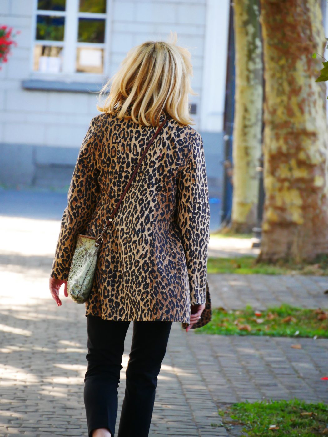 Mein Blazer ist tatsächlich über 20 Jahre alt und passt zu fast allem, was mein Schrank zu bieten hat. Im Laufe der Zeit habe ich ihm schon längere Ärmel verpasst und die Schulterpolster herausgenommen. Im Moment trage ich ihn oft zur schwarzen 7/8 Hose, mit weißem Shirt und einem Schuß Farbe bei Schal und Sneakern. Abends kommen Pumps drunter: In Schwarz wirkt’s classy, in Farbe – z. B. rot, gibt’s mehr Aufmerksamkeit. Ich bin ein großer Leo-Fan und es gibt verschiedene Wege, den Style zu tragen. Damit er richtig flasht, hier ein paar Tipps: Blazer oder Mäntel funktionieren zu fast allem. Wenn Sie auf Nr. Sicher gehen möchten, entscheiden Sie sich für einen großen Print. Je kleiner der Druck, umso schwieriger das Styling. Ebenso wichtig, eine lockere, fließende Paßform, schlauchschmal wirkt schnell cheap! Das gilt genauso für Hosen und Kleider. (Einen anderen Beitrag mit Leo-Kleid in lang, gibt’s hier) Leo-Rock? In Midilänge entwickelt er maximale Klasse egal, ob mit schwingender Weite oder schmal und figurbetont. Beste Kombipartner zu Leo sind Streifen und Blumen, very stylisch in ähnlichem Design: Große Leos gehen gern mit großen Streifen, kleine Leos lieber mit kleinen Blumen! Und welche Farbe? Leuchtendes Blau passt super zu Leo. Der Gelbton im Leo-Look wirkt elektrisierend zu Blautönen. Zu laut? Die angesagten Cameltöne sorgen für die leise, noble Version und Schwarz und Braun dazu geht sowieso klar!