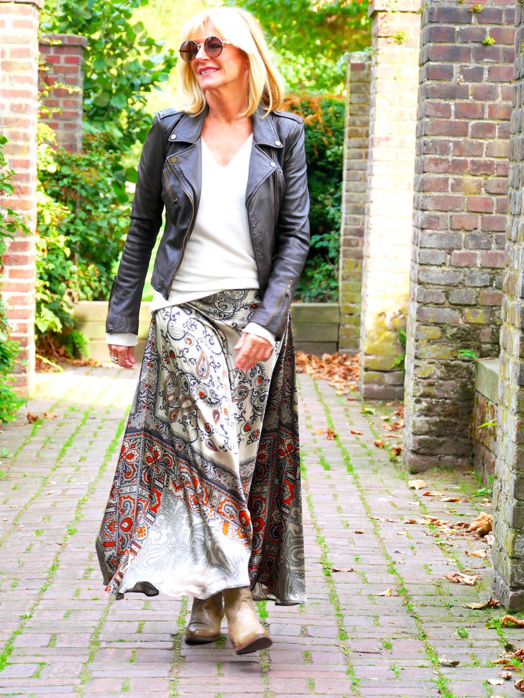 ModeInfo: Sie interessieren sich für den Seidenrock? Einfach eine Nachricht an CharismaLook über den Kontakt-Button. Lederjacke Zara, ähnlich hier. Cowoboy-Boots Vintage, ähnlich hier und hier. Blazer Zadig & Voltaire, ähnlich hier. Langarm-Shirt Zara. Top Seide Vintage, ähnlich hier. Sneaker Hogan, ähnlich hier. Tasche Zara. Ring/ Schmuck Foolsgold