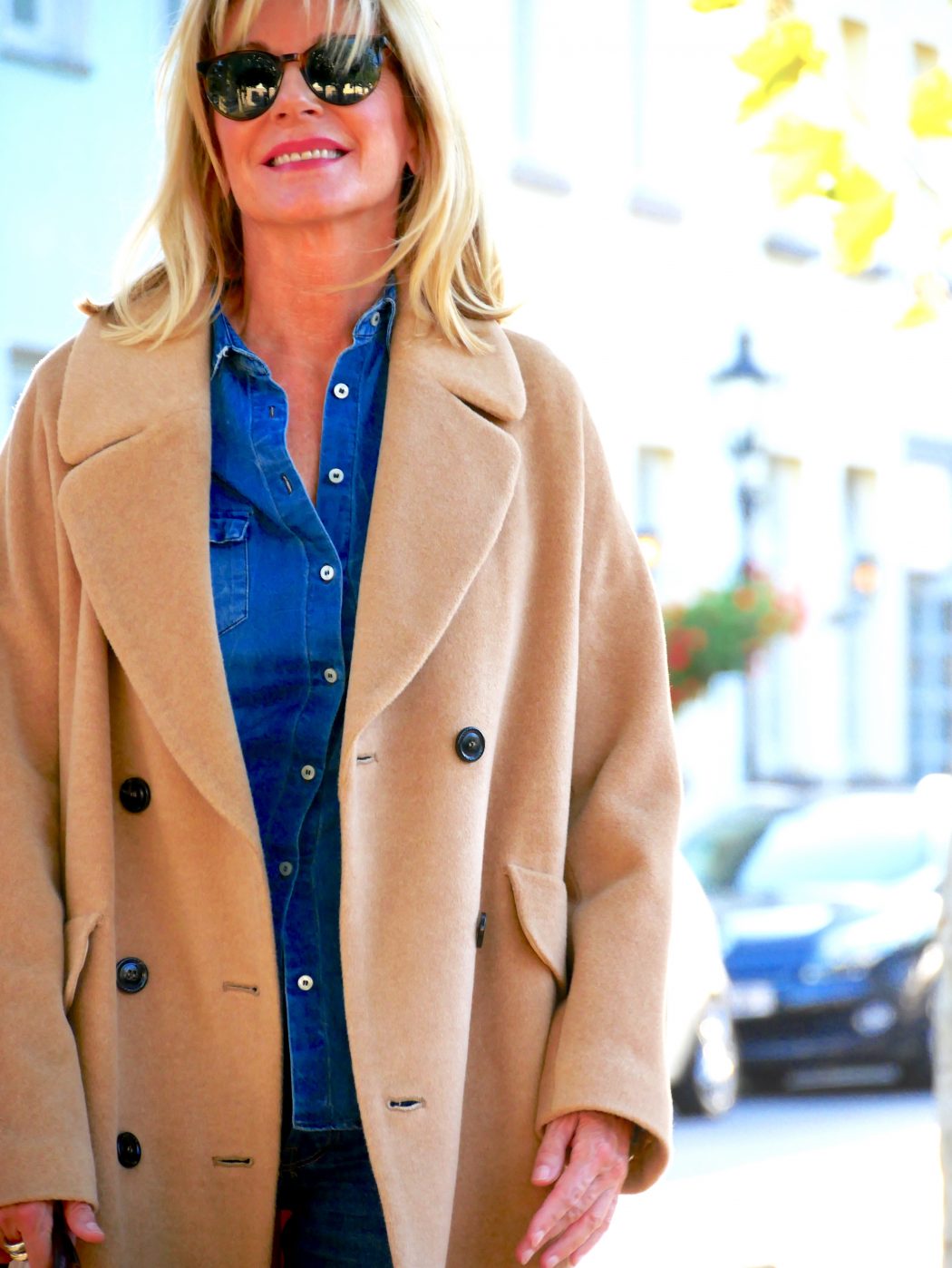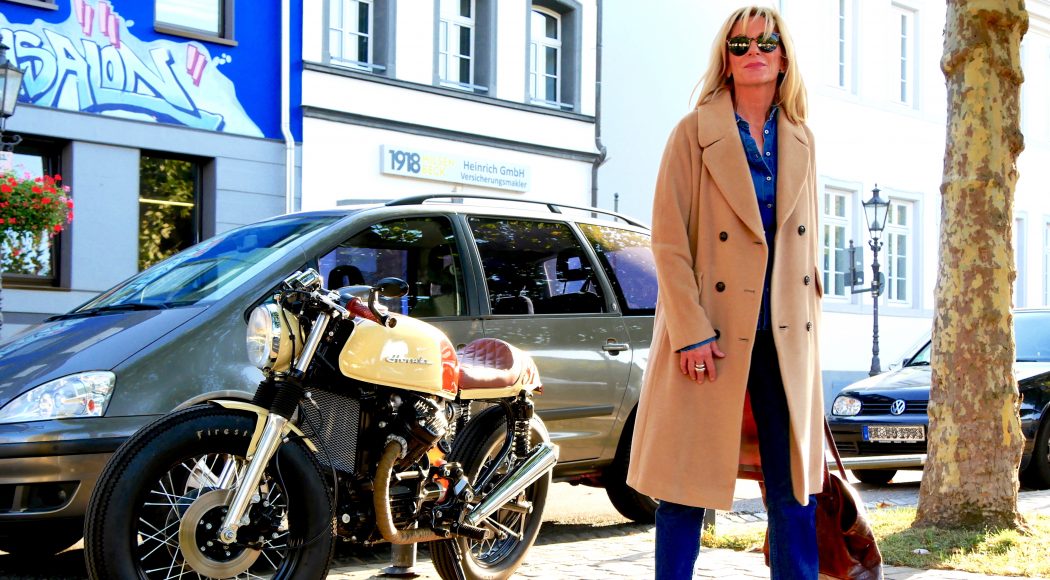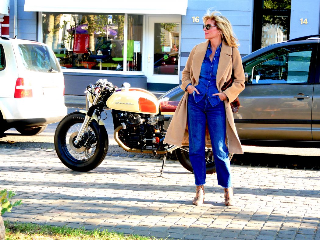 Selten hab‘ ich mich schockverliebt in ein Modeteil, was allerdings bei diesem Mantel passierte. Wenn mir ein Teil auch nach einer gewissen Zeit nicht mehr aus dem Kopf geht, dann muss mehr dran sein. An diesem Mantel IST mehr dran: Nicht nur, dass er zu allem passt, das ist schon mal kein schlechter Kaufgrund. Hier geht auch noch alles drunter, was Herbst und Winter klamottentechnisch zu bieten haben: dicke Pullis, Blazer, Jacken, Kleider wie Röcke … Und dann diese Farbe: Blonden Frauen steht der sanfte Camelton außerordentlich gut, aber auch zu dunklen Haaren und Teint – ein absoluter Schmeichler aus Alpaka mit Wolle, was leider seinen Preis hat! Aber schauen Sie mal, wie der zu Jeans aussieht, zu Brauntönen und zu Leo – wieder an den Füßen! Womit wir wieder am Anfang des Themas wären – die Boots trage ich jetzt schon die vierte Saison. Ich würde sagen: Läuft! Und noch mehr zum Thema Nachhaltigkeit: Die Tasche von Mulberry habe ich schon über 20 Jahre – mein Schuster hat gesagt, er repariert sie jetzt zum letzten Mal. Auch die Kittenheels von Prada, genauso alt, weniger getragen und immer noch prima in Schuss.