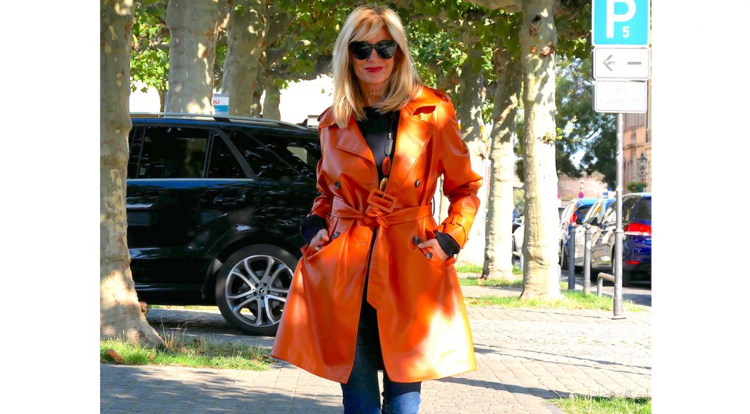 Dieser Trench kommt im Herbst mit der Option lange zu bleiben. Die warme Farbe macht ihn zum Style-Favorit für viele Outfits, die knapp kniekurze Länge immer modisch-praktisch. Tipp: Sieht auch klasse zu längeren Röcken und Kleidern aus = sichtbarer Lagen-Look! Hier verleiht er der Cropped-Jeans mit blauem Pulli im Handumdrehen Extrastil! Extra-Pluspunkt: Regen perlt an dem veganen Lederstück spurlos ab.