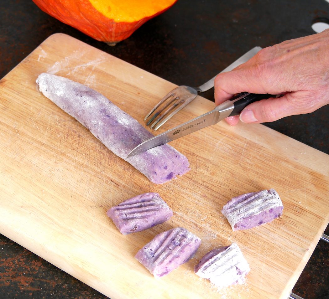Zubereitung Gnocchi: Die blauen Kartoffeln schälen (mit Handschuhen arbeiten, die Kartoffeln färben), mit wenig Salz kochen oder dämpfen, abkühlen lassen. Die Kartoffeln mit der Kartoffelpresse oder dem Stampfer gut zerdrücken, dann mit Ei und Eigelb, Mehl, Muskat, Kräutersalz zu einem Teig kneten. Dabei mit 100g Mehl anfangen, nur wenn nötig mehr dazugeben. Immer sparsam, Mehl ist kein Geschmacksverstärker!