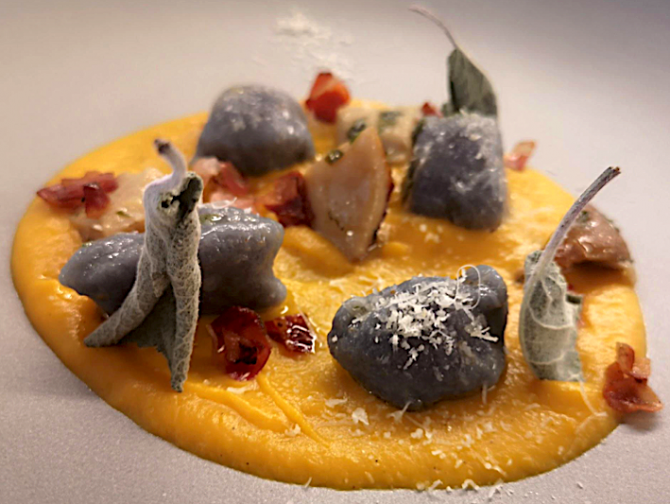 Lieblingsessen: Blaue Gnocchi mit Salbei-Butter, Kürbiscreme, geröstetem Speck und Pilzen