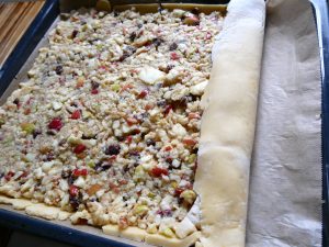 Zutaten Teig: 250g Butter, 300g Zucker, 500g Mehl, 1/2 Packung Backpulver, 100g Puderzucker, 1 Ei (oder 2 Eigelb), 4El Milch, 1 Packung Vanillezucker, etwas abgeriebene Zitronenschale, 1 Prise Salz. (Ich habe nur 400g Mehl genommen.)