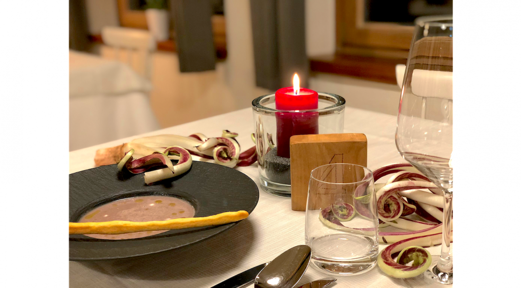 Zutaten für 4-6 Personen: 3 Radicchio, 4 mehlige Kartoffeln, 1 Zwiebel, 700ml Gemüsebrühe, 250ml kräftigen Rotwein (Ingrid empfiehlt „Teroldego“), 100ml Sahne, etwas Olivenöl, Salz & Pfeffer. Polenta Grissino.